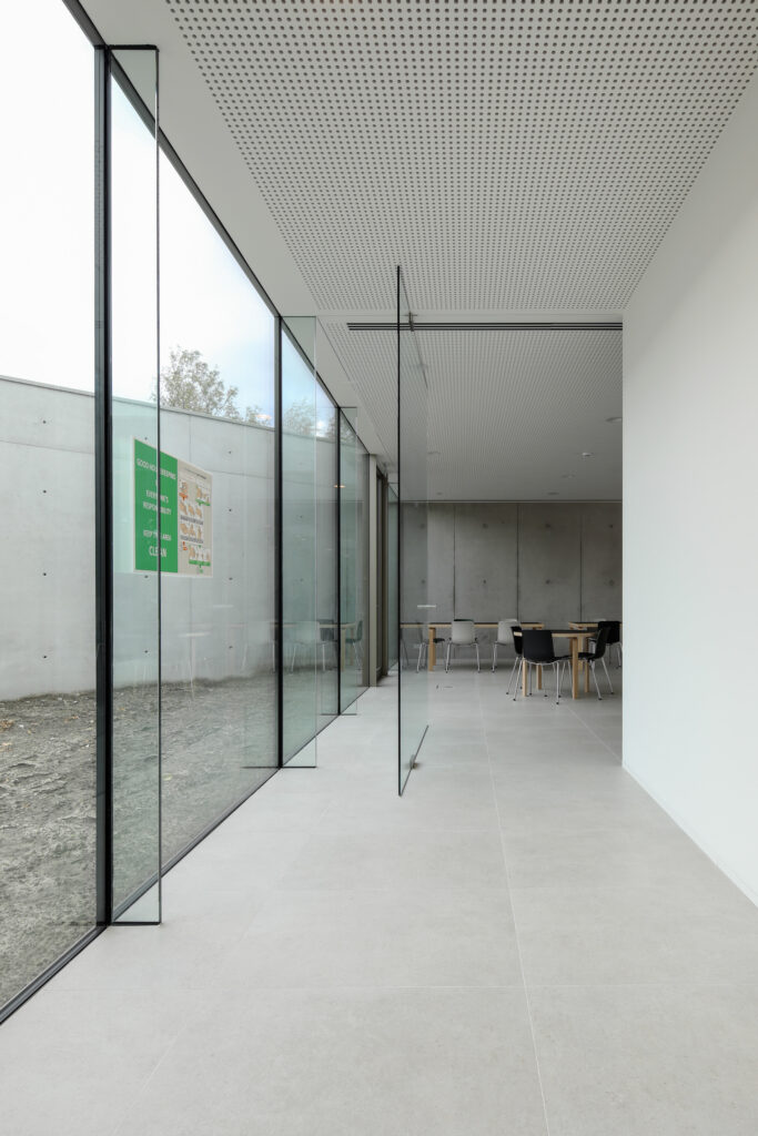 Op de verdiepingen werden brede doorvalbeveiligingen geplaatst die zorgen voor veiligheid zonder visuele dominantie. De glazen panelen zijn enkel zijdelings ingeklemd met slanke aluminiumprofielen. Dankzij het gebruik van gelaagd veiligheidsglas met DG41-folie waardoor een bovenprofiel overbodig is, blijft de balustrade stevig en veilig, met een uiterst minimalistische afwerking als resultaat.