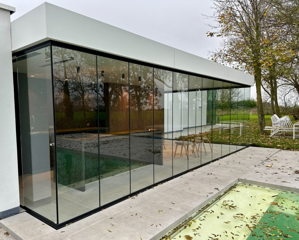 De klant wilde zijn poolhouse transformeren tot een volwaardige leefruimte, ook bij minder mooi weer, zonder in te boeten aan het open gevoel tijdens zonnige dagen. Met het Sliding Glass schuifsysteem vonden we de ideale oplossing.