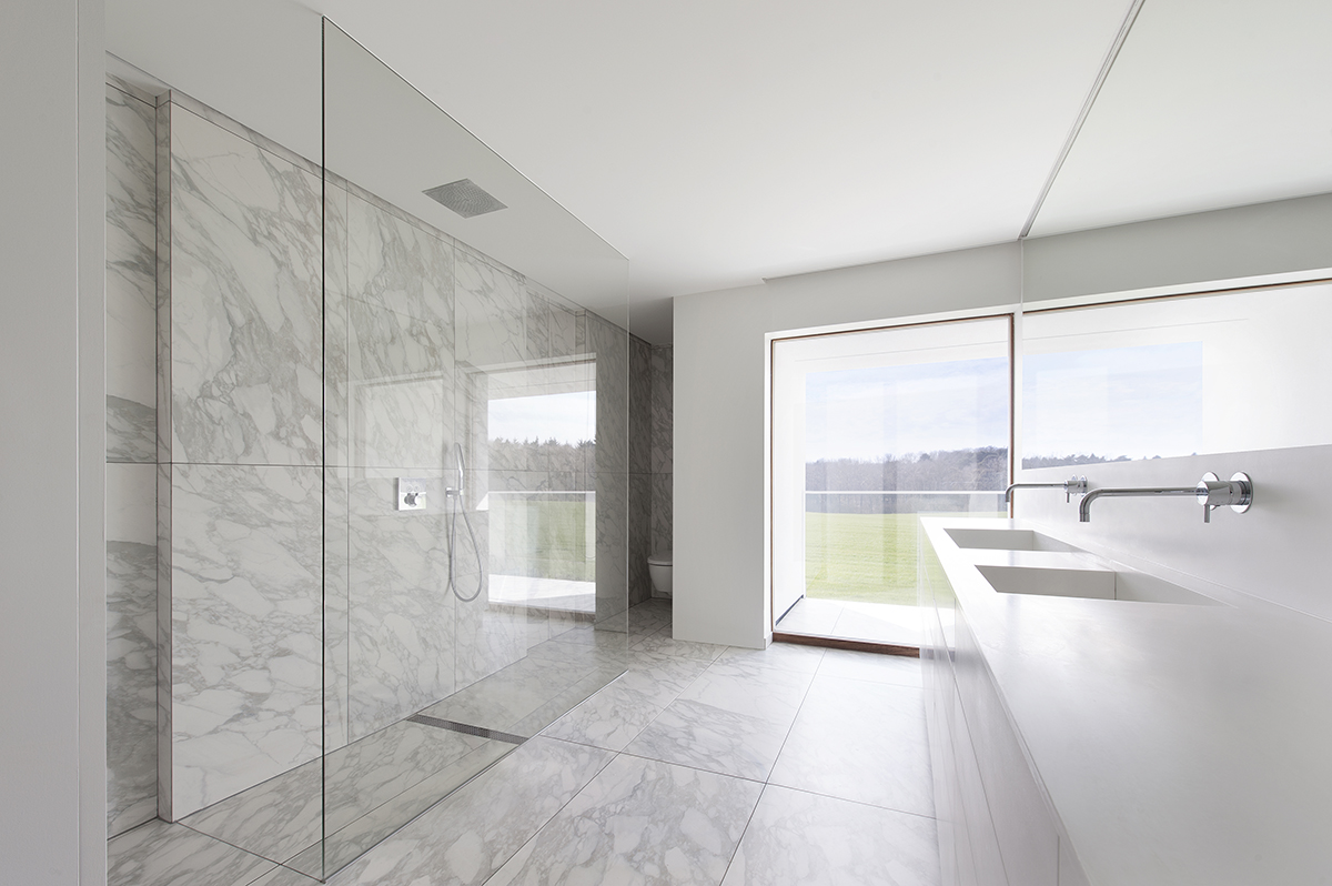 In de badkamer werd een geharde glazen wand van 2m50 op 2m50 en 125 kilo zwaar geplaatst om een langs twee kanten inloopbare douche te creëeren. Zowel boven als onder is de wand vastgezet in verzonken profielen die het glas doen verdwijnen in zoldering en vloer. In combinatie met de spiegel aan de andere kant opent de badkamer helemaal en verdubbelt ze visueel in grootte. De douchewand is behandeld met een anti-kalk product zodat er geen kalkaanslag verschijnt en de wand onderhoudsvriendelijk blijft.