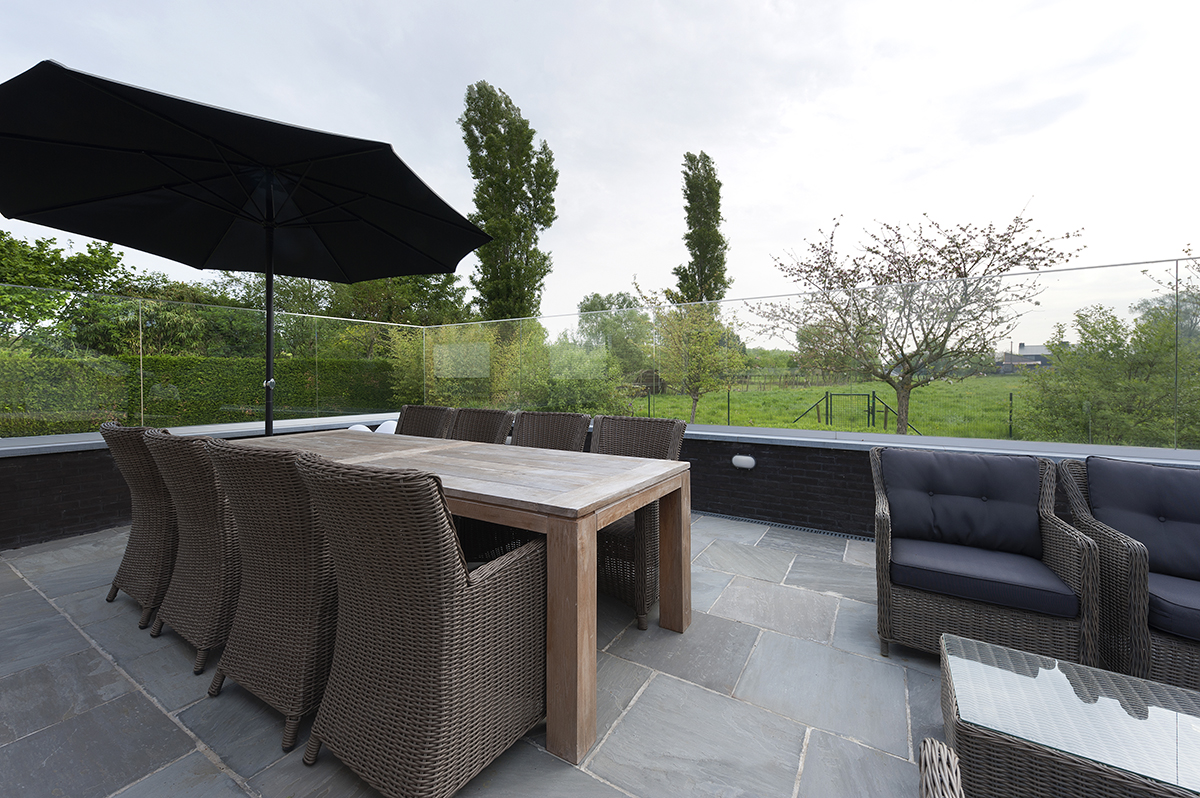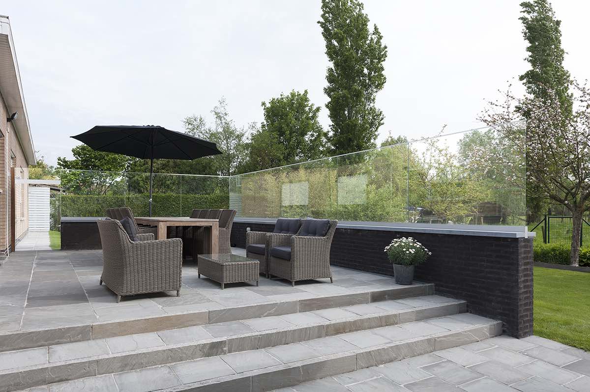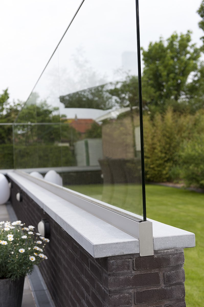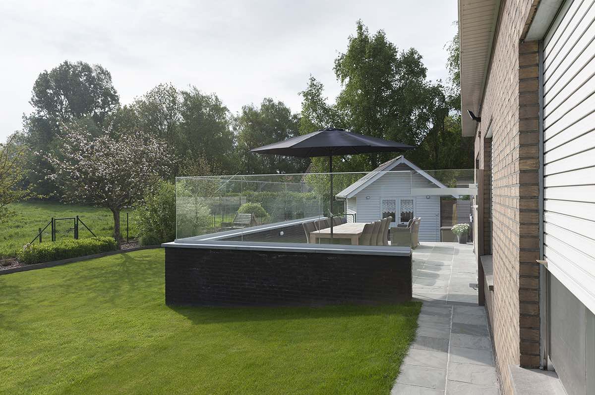 De klant wilde wel een glazen windscherm maar wilde de voorbereidingen zelf doen. “Met onze instructies kon de aannemer op de juiste manier een muurtje bouwen waarop we onze panelen konden zetten”. We hielpen de klant ook met de keuze van wel of geen muurtje en in welke verhoudingen de glazen panelen zouden staan. “In dit geval 1m20 hoog en 1m60 tot 1m80 lang, de juiste verhoudingen die het verschil maakten”. Daarom werden de glazen panelen ook half verzonken op het muurtje gezet en achteraf afgewerkt met blauwe steen: “Proper werk, proper resultaat”.